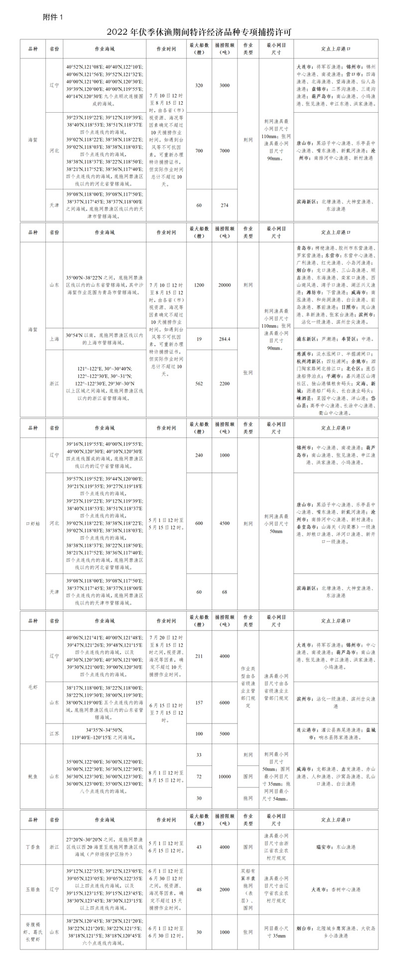 2022年伏休期间专项捕捞许可品种为海蜇、口虾蛄、毛虾、鱿鱼、丁香鱼、玉筋鱼和脊腹褐虾、葛氏长臂虾。上述品种专项捕捞许可作业海域、作业时间、作业船数、捕捞限额、作业类型、渔具网目尺寸和定点上岸渔港等详见附件1。