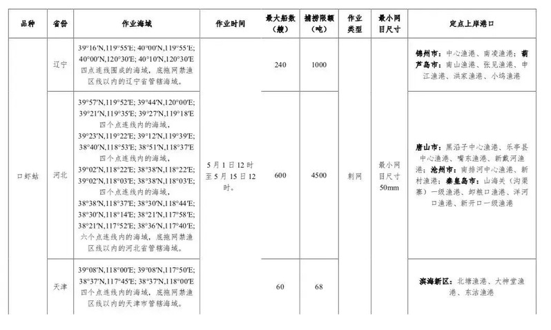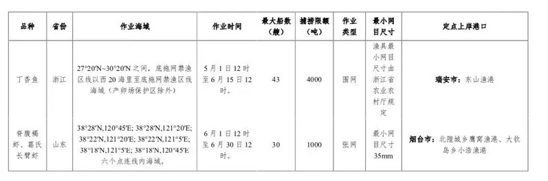 2022年伏季休渔期间专项捕捞许可品种为海蜇、口虾蛄、毛虾、鱿鱼、丁香鱼和脊腹褐虾、葛氏长臂虾。上述品种专项捕捞许可作业海域、作业时间、作业船数、捕捞限额、作业类型、渔具网目尺寸和定点上岸渔港等详见附件1。