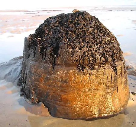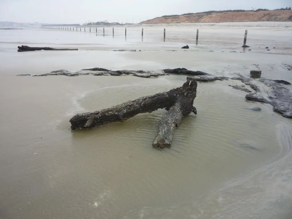 海底古森林遗迹距今有7500多年,主要分布于距海岸100m~200m外,通常水深约 2~3m的潮间带,呈三片分布,已发现有60余棵以上,原始直立状态保存良好。据鉴定,这些海底古森林遗迹以裸子植物油杉为主,夹有皂荚树、桑树、南亚松等多个属种。