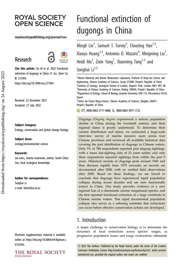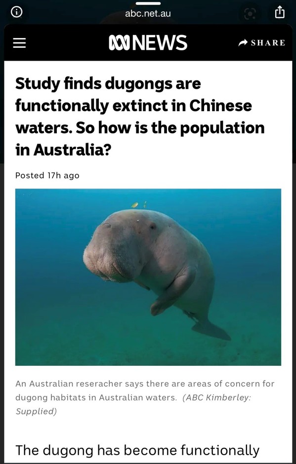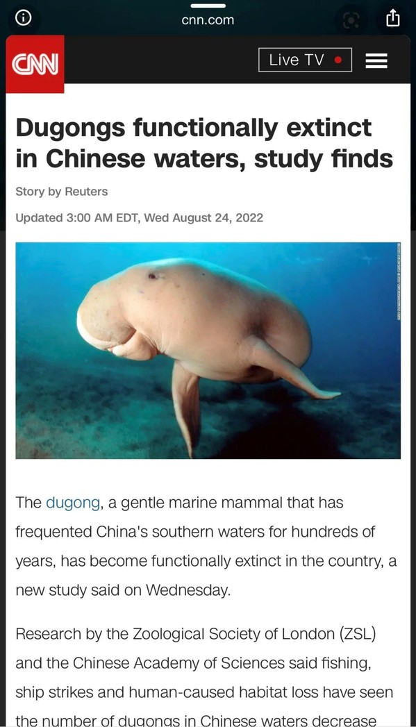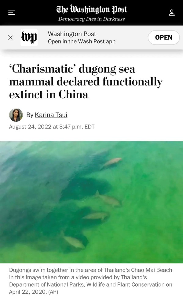 阿联酋《国家报》8月24日文章,原题:儒艮被宣布在中国功能性灭绝,这为保护工作“敲响警钟”。
