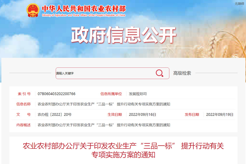近日,农业农村部办公厅印发了关于农业生产“三品一标” 提升行动有关专项实施方案的通知,推进农业生产“三品一标”是推动农业绿色高质量发展的重要抓手,是贯彻落实中央一号文件决策部署的重要举措。通知要求各级农业农村部门要高度重视农业生产“三品一标”提升行动实施,加强统筹协调,健全工作机制,务实推动各项任务落实。