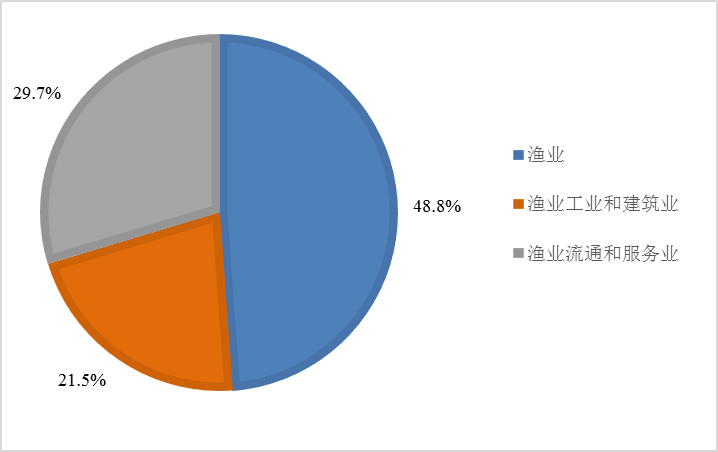 2023年,按当年价格计算,全社会渔业经济总产值32669.96亿元,其中渔业产值15957.35亿元,渔业工业和建筑业产值7018.84亿元,渔业流通和服务业产值9693.76亿元,三个产业产值的比例为48.8∶21.5∶29.7,如图1所示。渔业流通和服务业产值中,休闲渔业产值923.47亿元,同比增长8.98%。