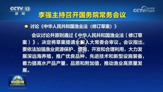 会议讨论并原则通过《中华人民共和国渔业法(修订草案)》,决定将草案提请全国人大常委会审议。会议指出,要依法加强渔业资源保护、增殖、开发和合理利用,大力发展深远海养殖,推广优良品种、先进技术和新型设施装备,着力提高水产品产量、品质和附加值,推动渔业高质量发展。