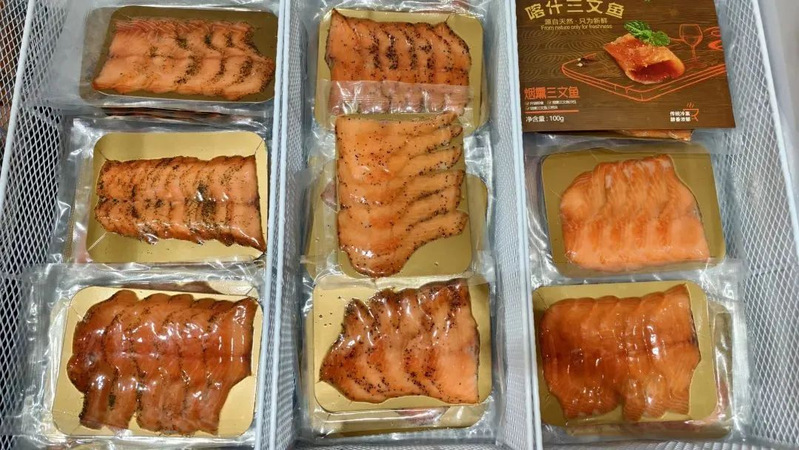 喀什古城景区喀什三文鱼销售店内,带皮鱼柳、带皮鱼段、去皮鱼腩段、刺身,更有原味、香草芬芳、黑胡椒辛香交织的烟熏鱼片共计十种风味独特、令人垂涎的三文鱼,成为市民及游客的热宠,更是喀什市特色养殖蓬勃发展的生动展示窗口,让每一位踏入店内的顾客都能感受到喀什古城在新时代的活力与魅力。