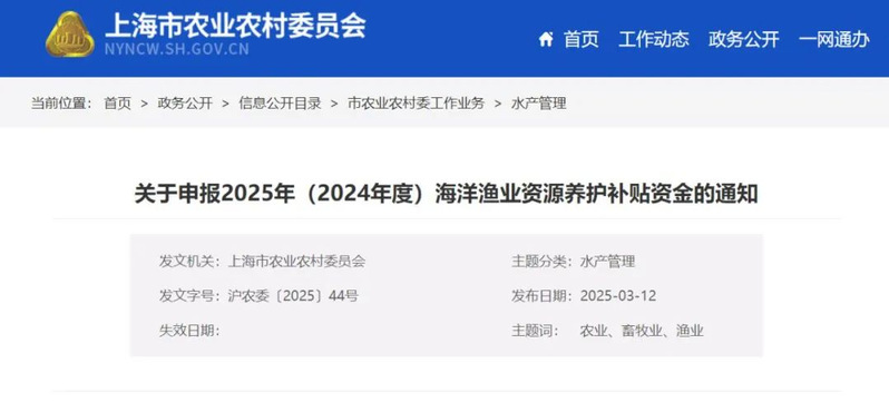 根据《农业农村部办公厅财政部办公厅关于实施海洋渔业资源养护补贴政策的通知》(农办计财〔2021〕44号)、《关于印发<上海市2021—2025年海洋渔业资源养护补贴政策实施方案>的通知》(沪农委规〔2022〕3号)要求,现将我市2025年(2024年度)海洋渔业资源养护补贴资金申报工作有关事项通知如下: